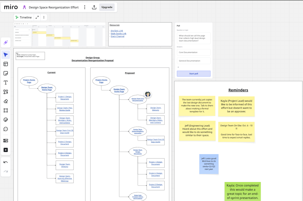 Here’s an example of a board I might create to help a team plan reorganizing their documentation. (Public Miro board link.)