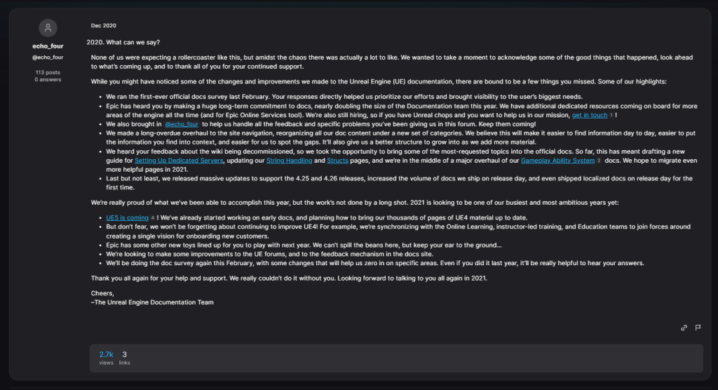 My main experience with community management comes from my time at Epic Games as a technical writing contractor (APR 2020 – FEB 2021). While there, I managed feedback that users submitted via the Unreal Engine (UE) documentation forums.